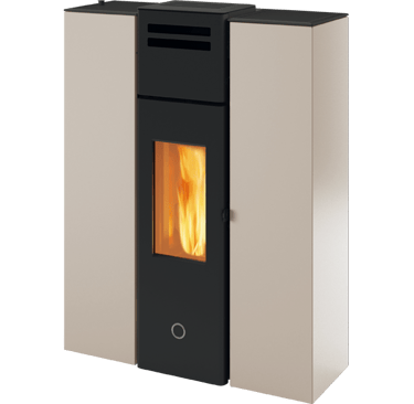 Poêle à granulés étanche canalisable « gain de place » avec seulement 30,5 cm de profondeur, au design linéaire, idéal pour le couloir mais adapté à tous les espaces de la maison. Avec porte en fonte et côtés en acier.