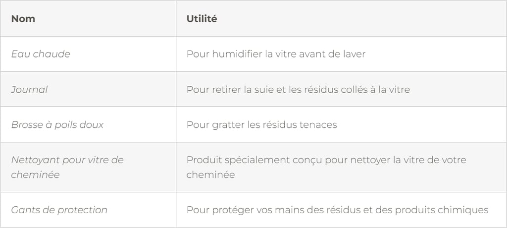 Pour nettoyer efficacement la vitre de votre cheminée, vous aurez besoin des outils et produits suivants :