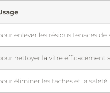 Appliquez le nettoyant : Vaporisez le nettoyant sur la surface de la vitre et laissez-le agir pendant quelques minutes. Assurez-vous de lire attentivement les instructions du produit avant de l’utiliser.