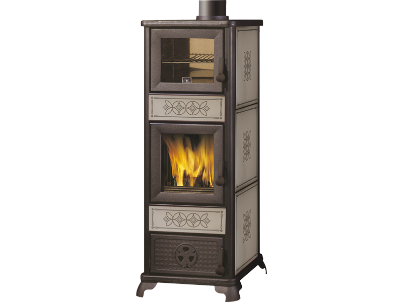 Poêle à bois au style rustique doté d’un four en acier inox (27x30x24h cm), avec côtés et inserts en céramique décorée, porte et pieds en fonte.