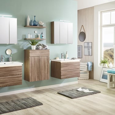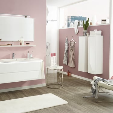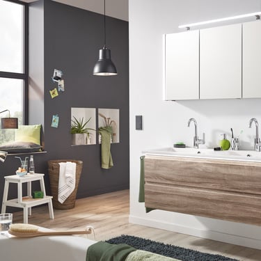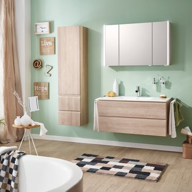 Notre série Facto séduit par la pureté de ses lignes sans renoncer à la touche d’élégance qui égaye votre salle de bains. Montés au mur, le meuble sous vasque, l’armoire mi-haute et le meuble bas semblent flotter, conférant légèreté et délicatesse à cet aménagement. Les chants chromés et les pieds, disponibles en option, mis en valeur par l’éclairage LED performant, subliment la salle de bains.