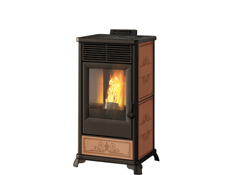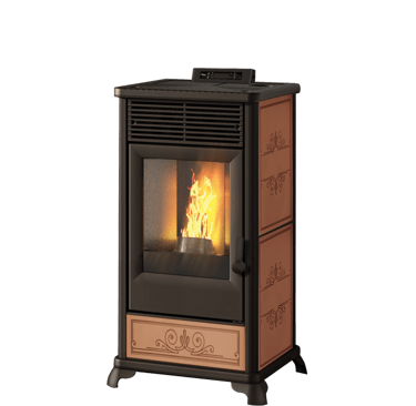 Poêle à granulés canalisable au style traditionnel avec côtés et insert en céramique décorée. Porte et grille d’air chaud en fonte.