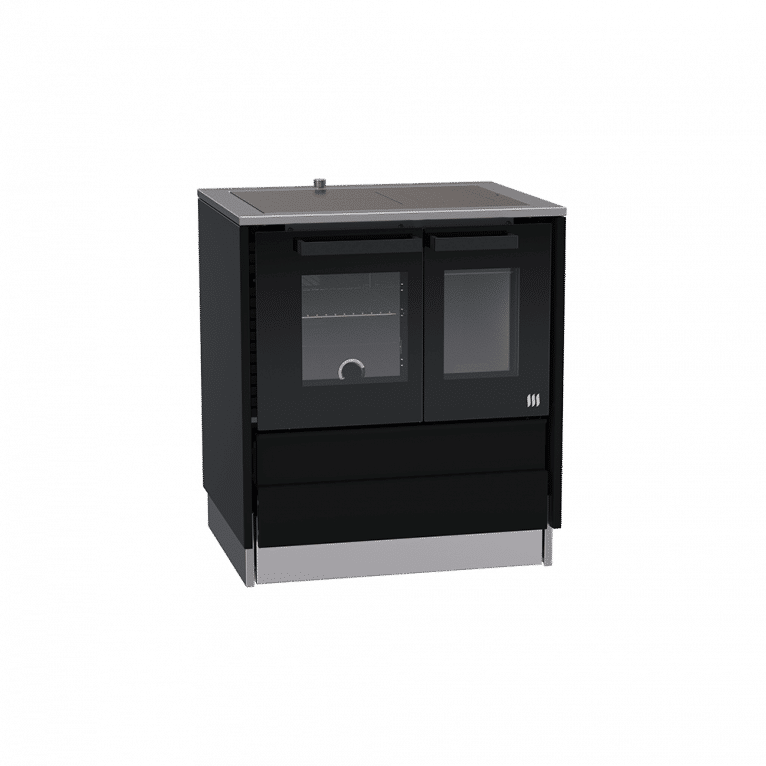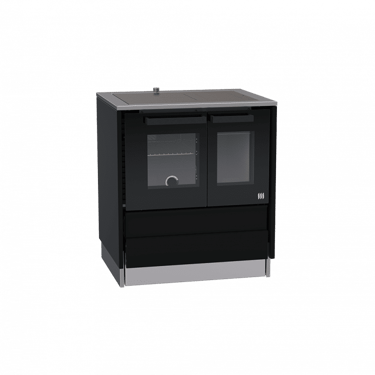 Une cuisinière à bois comme vous n'en avez jamais vu. Ici les valeurs traditionnelles sont interprétées de manière contemporaine. Moderne, avec des façades en verre noir mat brillant et des lignes claires et droites.