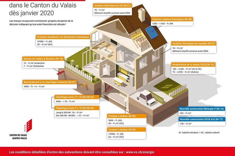 Le Canton du Valais encourage la transition vers des énergies renouvelables. Les aides peuvent atteindre jusqu’à 15 000 CHF pour des systèmes domestiques performants au bois ou pellets