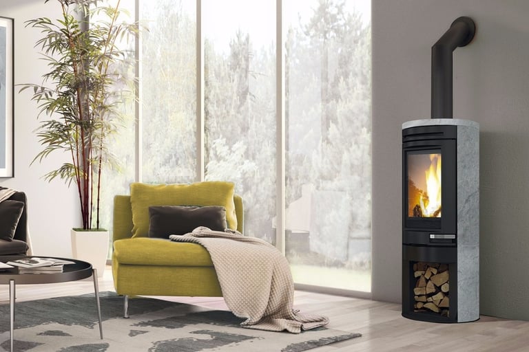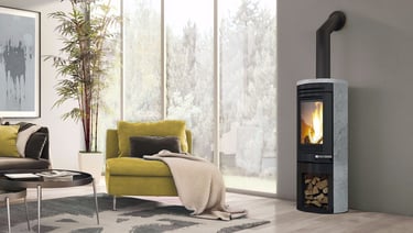 Poêles à bois. Avec une vitre verticale galbée qui exalte la vision de la flamme.