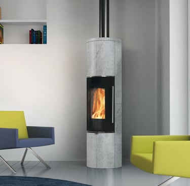Poêles à bois. Avec une vitre verticale galbée qui exalte la vision de la flamme.
